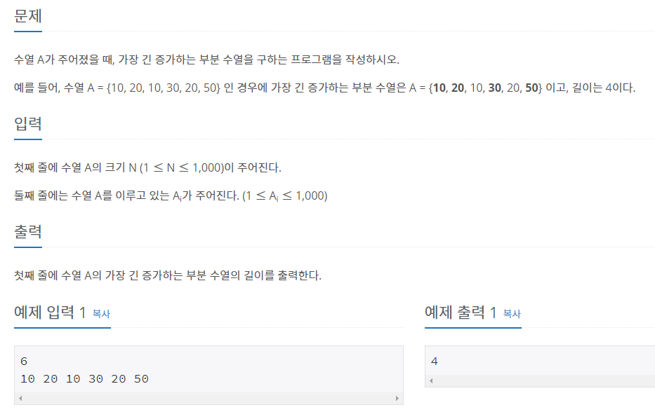 백준 11053번 문제 "가장 긴 증가하는 부분 수열"