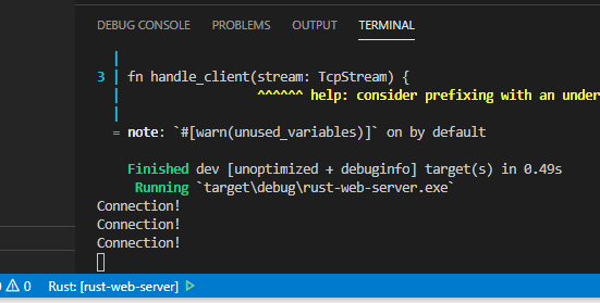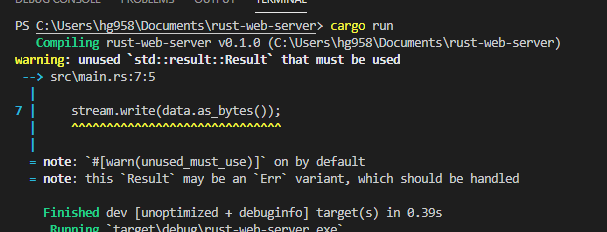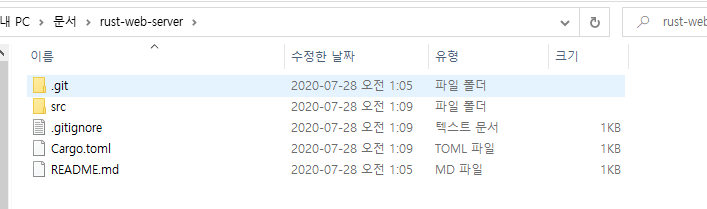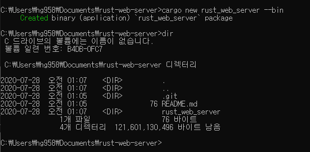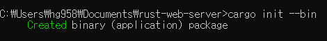 이제 rust project를 카고로 만들어줘야 하는데, cargo new rust_web_server --bin 이라는 명령어로 프로젝트 디렉토리를 만들 수 있다.