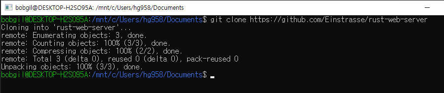 그리고 repository를 clone할 디렉토리에서 WSL win bash를 켠 뒤, git clone을 해준다.