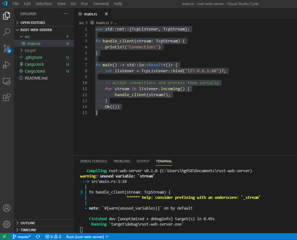 일단 웹 서버이니 TCP 소캣을 열 수 있어야 한다. Rust에서 소캣 프로그래밍을 어떻게 하는지를 한번 알아보자.