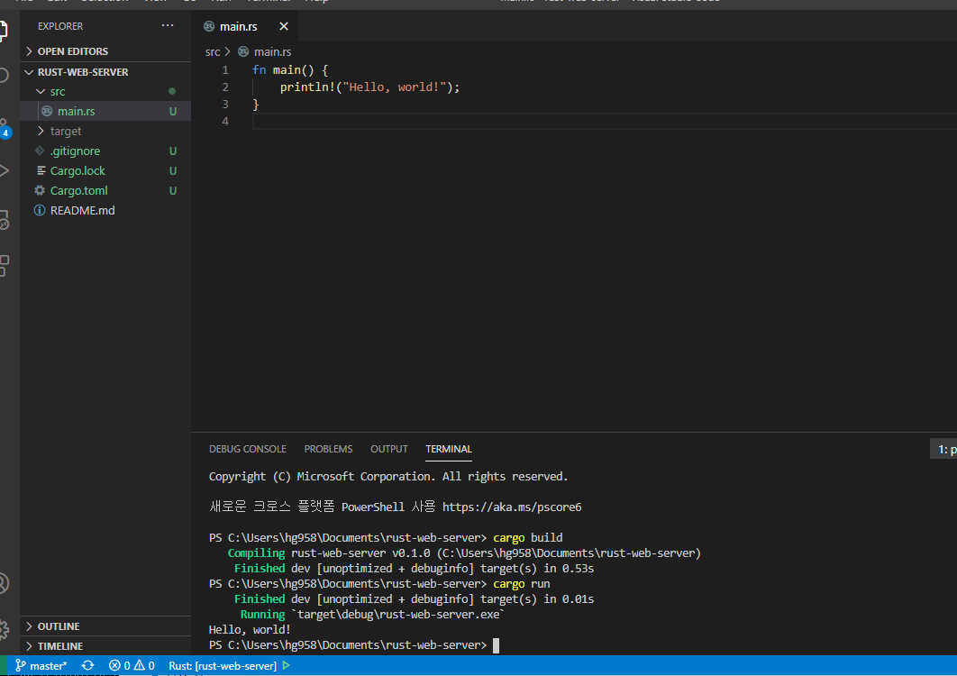 아래 터미널을 열어서 cargo build와 cargo run을 쳐 보니, Hello, world!가 잘 되었다.
