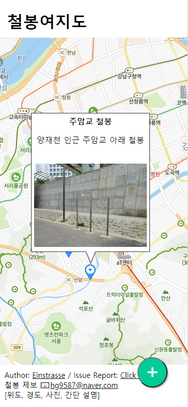 일단 철봉 지도 웹 하단에다가 링크를 두긴 했는데, 데이터 추가는 내 이메일로 철봉의 위도, 경도, 간단한 설명과 사진 정도를 보내주면 된다. 위도와 경도는 저기 지도 웹에서 우측 하단에 +라고되있는 버튼을 누르면 숫자로 나타나게 된다.