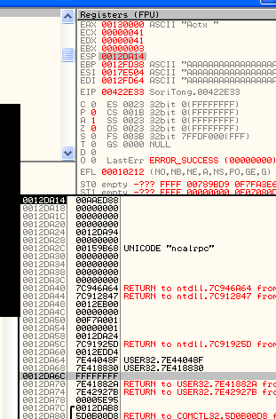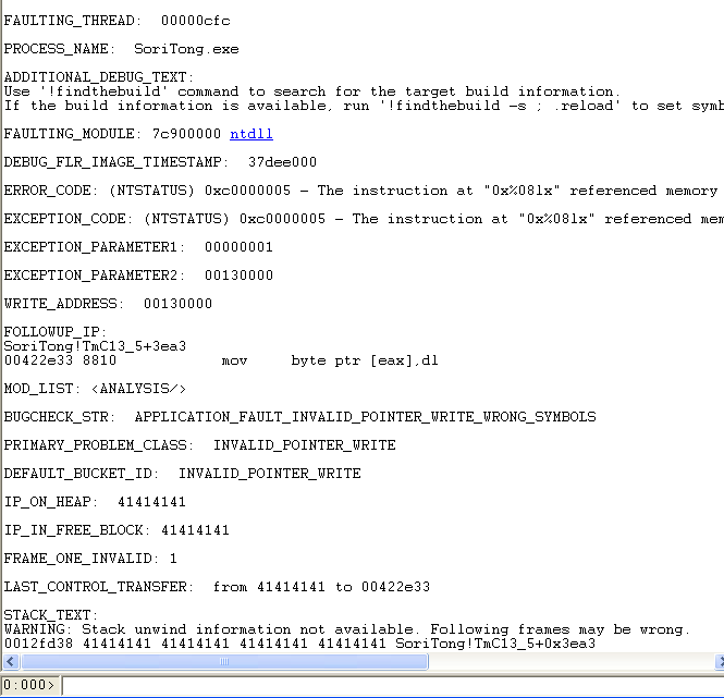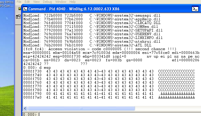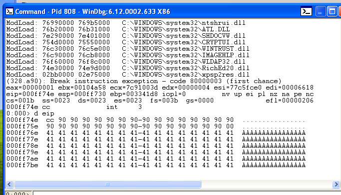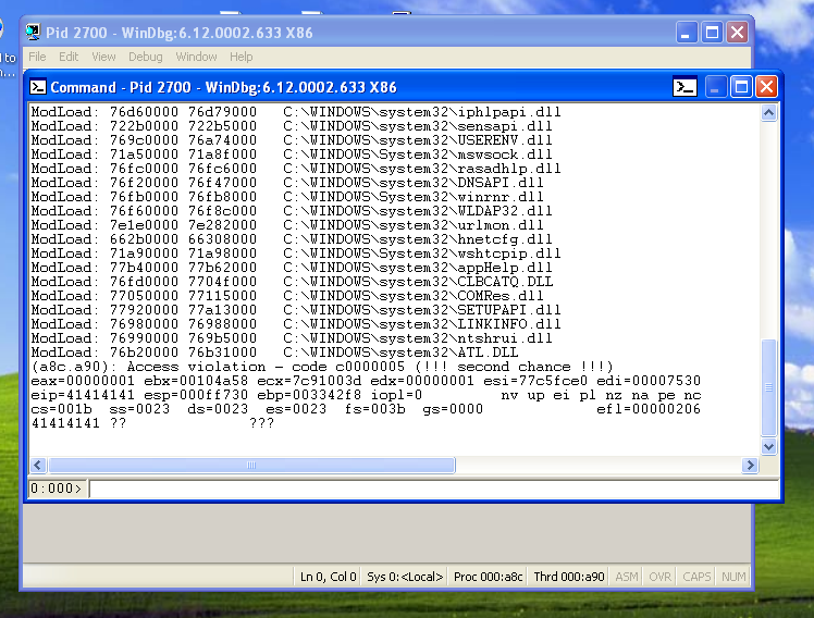 Windbg가 나타나고, eip가 41414141이 된 것을 알 수 있다.