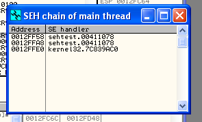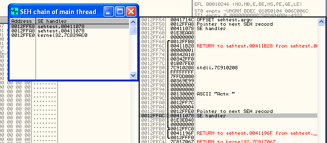 그리고 이 SEH 체인의 첫번째 주소를 가리키는 포인터는, 앱의 main 함수가 있는 곳의 데이터 블럭, 혹은 TEB(Thread Environment Block, 쓰레드 정보를 가지고 있는 OS 자료구조, TIB; Thread information block라고도 불림)에 저장됩니다.