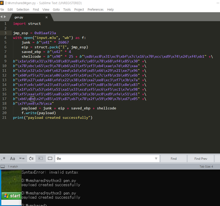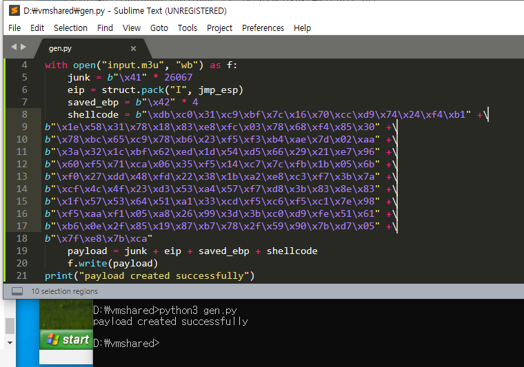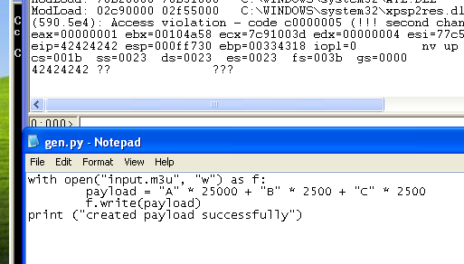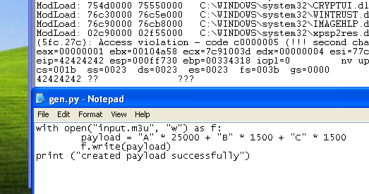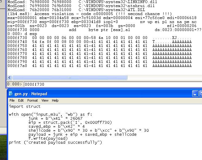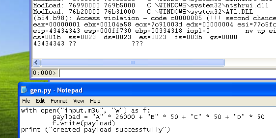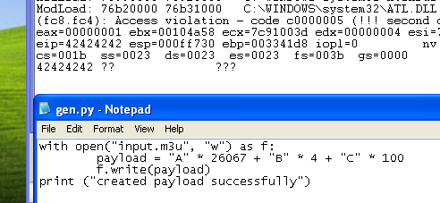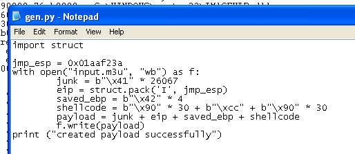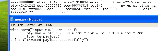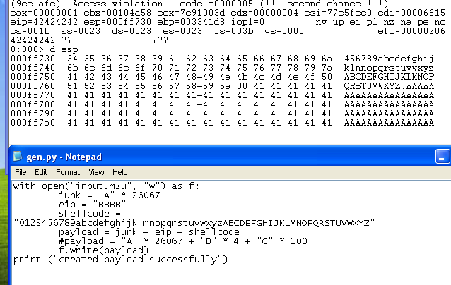 코어랜 블로그에서 했던 것 처럼 EIP를 덮어쓴 뒤 esp가 가리키는 곳에 값을 쓰는 부분에 쉘코드를 올리도록 준비를 해 보자. 아래와 같이 m3u파일을 생성해서 실행해보니, 쉘코드의 0~3까지 즉 4byte가 잘리고 나머지 부분이 잘 올라가있다.