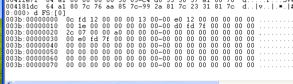 위키에 안그래도 잘 설명이 되어 있네요. FS:[0]에는 SEH 프레임의 주소가 4바이트로 저장되어있다고 합니다.