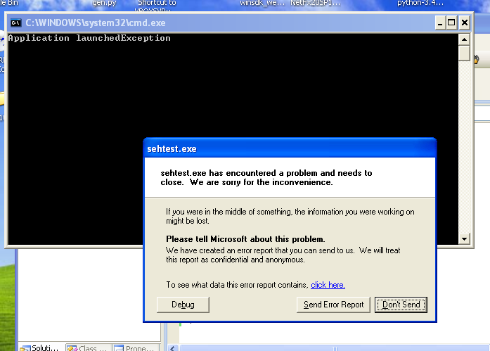 SEH로 넘어가게 되면, 무슨무슨 앱이 크래시 나서 꺼졌습니다~ 라는 OS단의 에러메시지가 나게 되는데, 따라서 훌륭한 개발자라면 SEH로 넘어가기 전에 개발 언어 자체에 있는 예외 처리 루틴에서 최대한 처리하도록 해주는게 좋습니다.