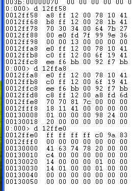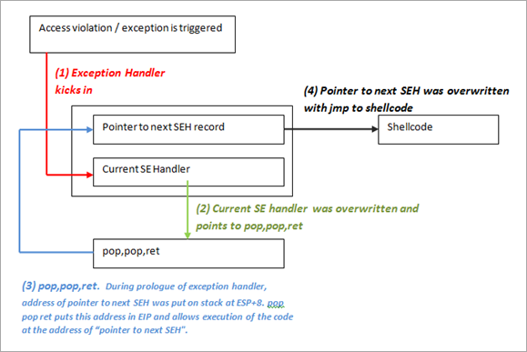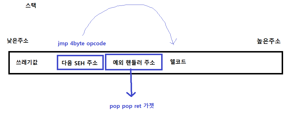 - 만약 handler 주소가 이미 등록된 핸들러 주소로 덮어쓰였다면, 정상적으로 SEH로 넘어가게 됩니다. 이 경우는 기존에 있는 핸들러가 쉘코드를 깨지 않고 익스플로잇 하는데에 도움이 되는 경우입니다. 그리고 이런경우가 드물긴 한데 실제로 일어나기도 한다고 합니다.
