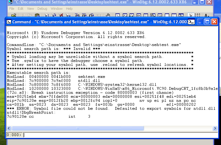 Windbg를 킨 뒤, File - Open Executable로 sehtest.exe를 열어보았습니다. 실행을 해버리면 크래시가 나니 이 상태만 보라고 하네요.