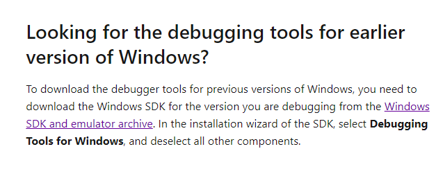 근데 Microsoft 공식 windbg 다운로드 페이지로 가니, Windows SDK를 설치할 때 그 패키지 안에 같이 포함되어있다고 한다. 그중 Debugging Tools for Windows를 고르면 된다고 한다.