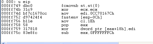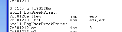 그리고 u 7c90120e를 치면 아까 우리가 쓴 값의 부분이 디스어셈블되서 보인다.
