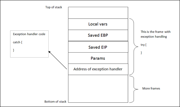 Local vars에서 buffer overflow가 나게 되면, 지역변수 밑에 있는 saved ebp, saved eip(ret addr) 및 함수 인자들과 이런 것들을 다 덮어쓰게 되는데, 맨 마지막에 address of exception handler가 보이지요?