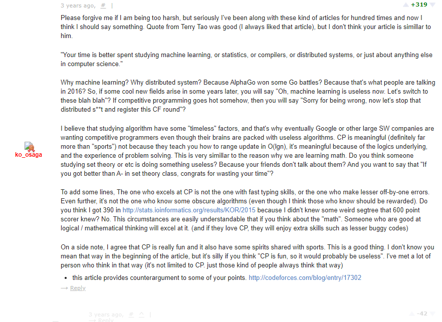 끝으로 구사과님이 알고리즘 대회 열심히하는게 무용하다'라는 의견의 코드포스 블로그에 남긴 댓글 링크를 걸면서 이만 글을 줄이겠습니다.