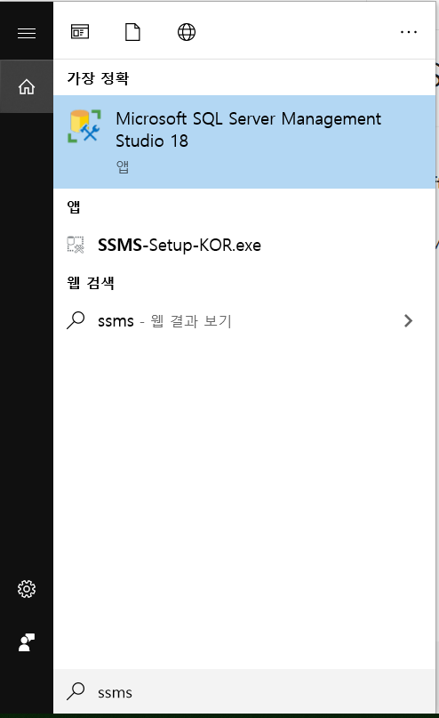 일단 SSMS를 실행해야 하므로, 시작메뉴에서 SSMS를 검색한다.