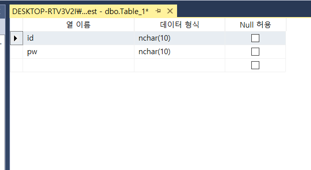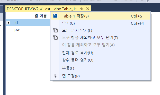 열 이름과, 데이터 형식을 설정한 뒤 탭에 마우스 우클릭을 해서 저장을 누른다.