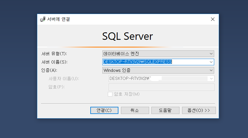 SQL 서버 접속 관련된 내용이 뜨는데, 그냥 기본값 그대로 연결을 눌러본다.