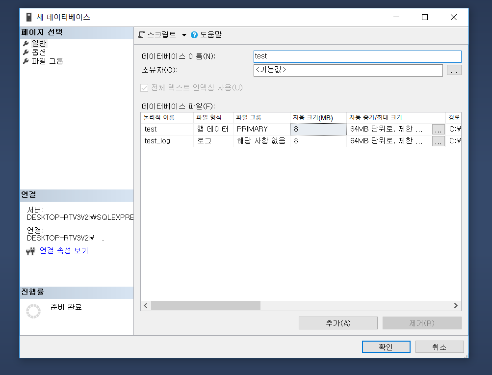 데이터베이스 이름에 test라고 입력 해보았다. 그러자 아래에 논리적 이름에 2개의 항목이 자동으로 이름이 기입이 된다.