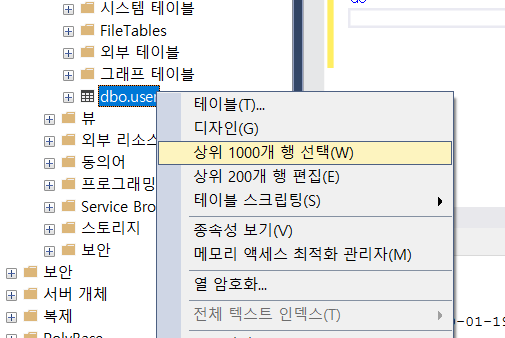 그러면 하단에 새로운 테이블 dbo.user가 추가된 것을 확인할 수 있다.