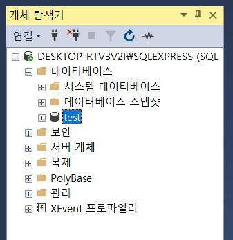 새 데이터베이스 "test"가 추가된 것을 알 수 있다.
