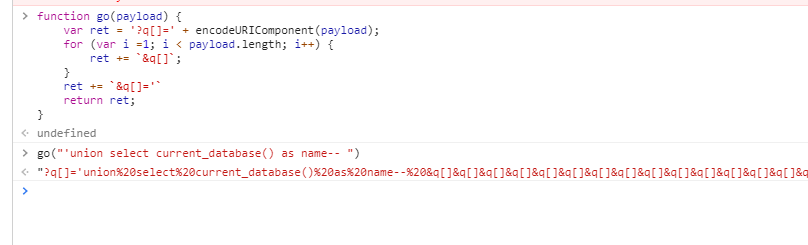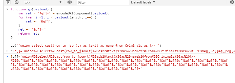 이러한 조건에 맞는 query string payload를 만들어주는 js 코드를 작성해서 요청을 보내보았다.