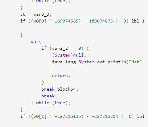 if ((v0[0] ^ 189074585) - 189074673 != 0) lbl-1000: // 3 sources: