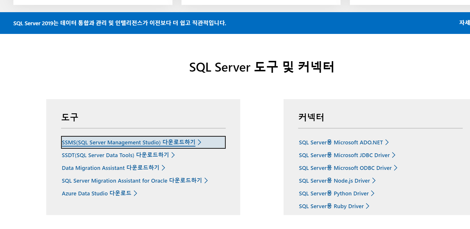 MySQL에는 MySQL Workbench가 있다면 MS-SQL에는 SSMS가 있다. 다운로드 페이지에서 스크롤을 아래로 더 내려보면 좌측에 SSMS 링크가 있다. 눌러보자.